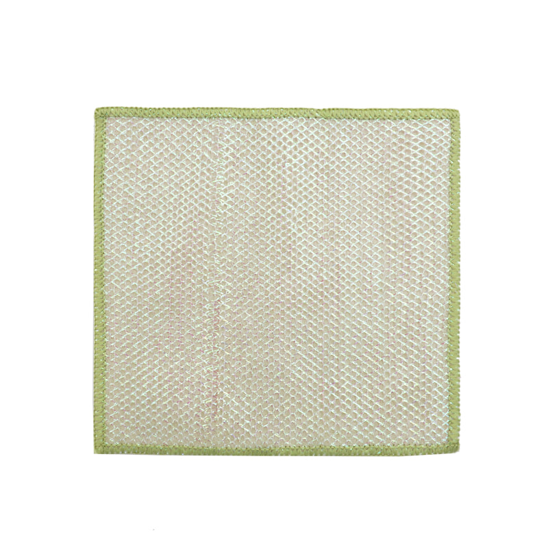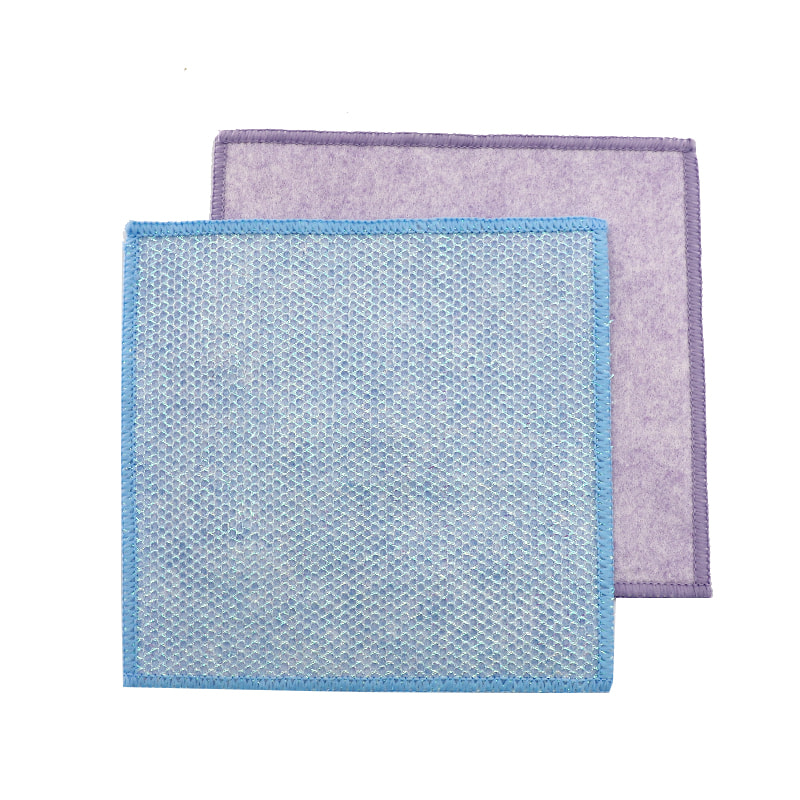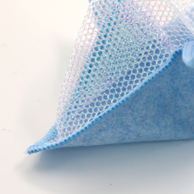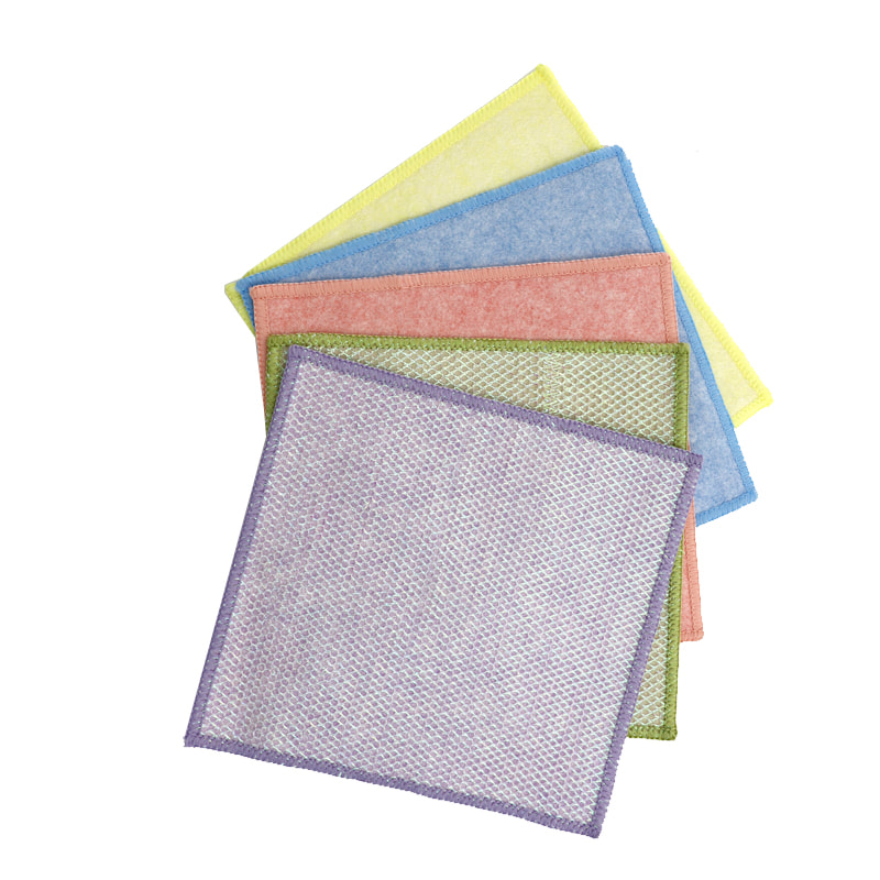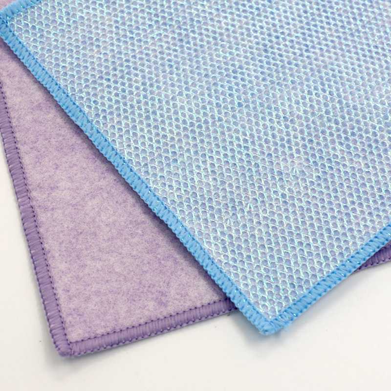 Struktura posebnog oblika, šarena, visokog izgleda; Jedna strana je šarena tkanina za čišćenje sa snažnom sposobnošću struganja, a druga strana je mrežasta tkanina, koja ispunjava dvostruke funkcije čišćenja tijekom struganja; Ne sadrži ulje i ima snažnu apsorpciju vode. Jedna strana je implantirana šarenom svilom raznih uzoraka, a druga strana je površina od viskozne tkanine koja ne masti i upija vodu, što je lijepo i može ispuniti dvostruke funkcije ribanja i ribanja s jedne strane.