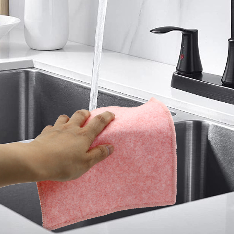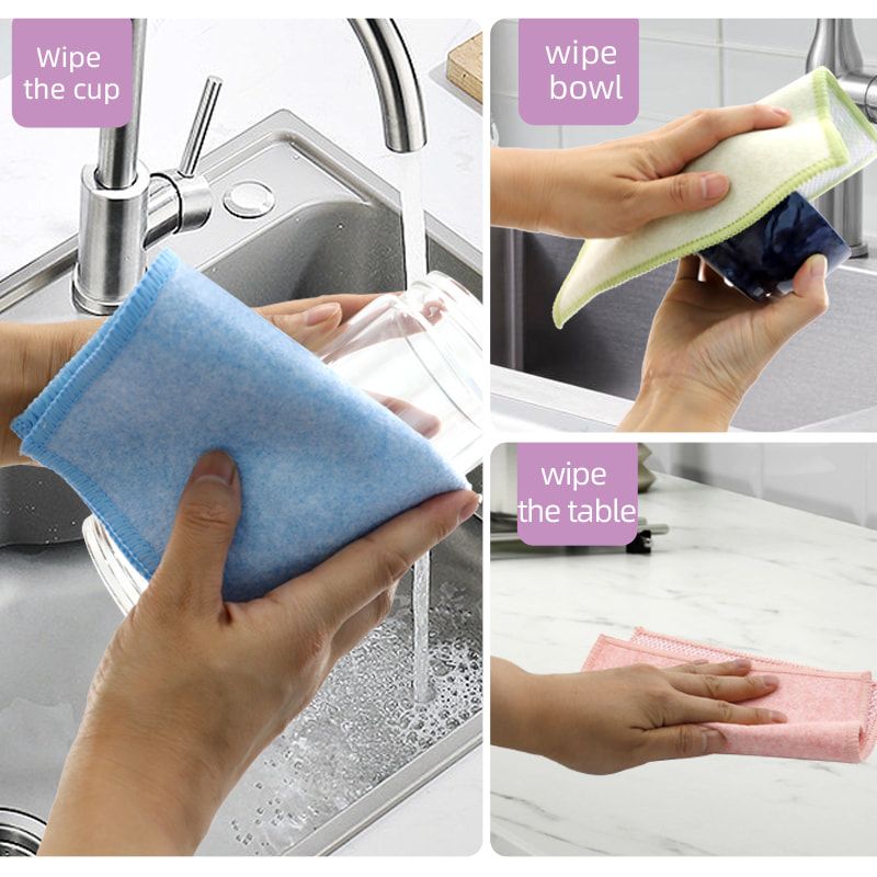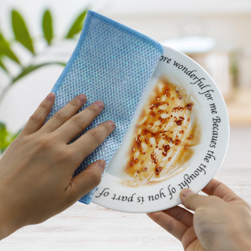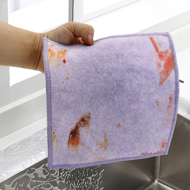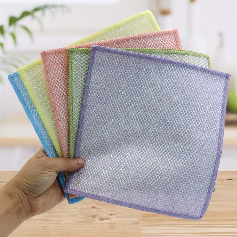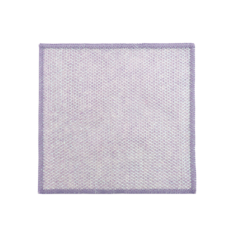 Struktura posebnog oblika, šarena, visokog izgleda; Jedna strana je šarena tkanina za čišćenje sa snažnom sposobnošću struganja, a druga strana je mrežasta tkanina, koja ispunjava dvostruke funkcije čišćenja tijekom struganja; Ne sadrži ulje i ima snažnu apsorpciju vode. Jedna strana je implantirana šarenom svilom raznih uzoraka, a druga strana je površina od viskozne tkanine koja ne masti i upija vodu, što je lijepo i može ispuniti dvostruke funkcije ribanja i ribanja s jedne strane.